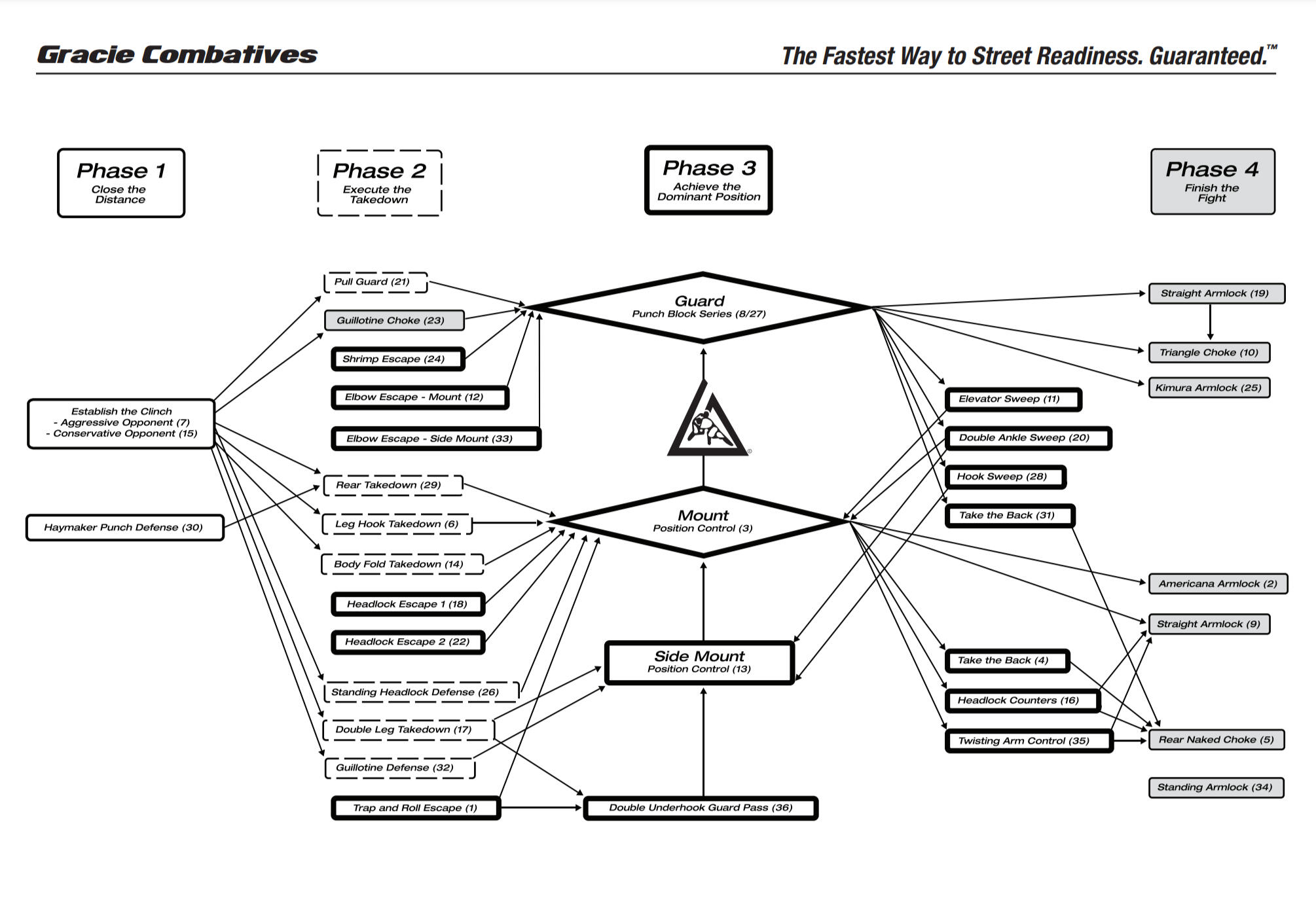 Below are how the 36 techniques are broken down into 4-Phases of a fight. Below is the visual framework to the techniques you'll be learning and incorporating.